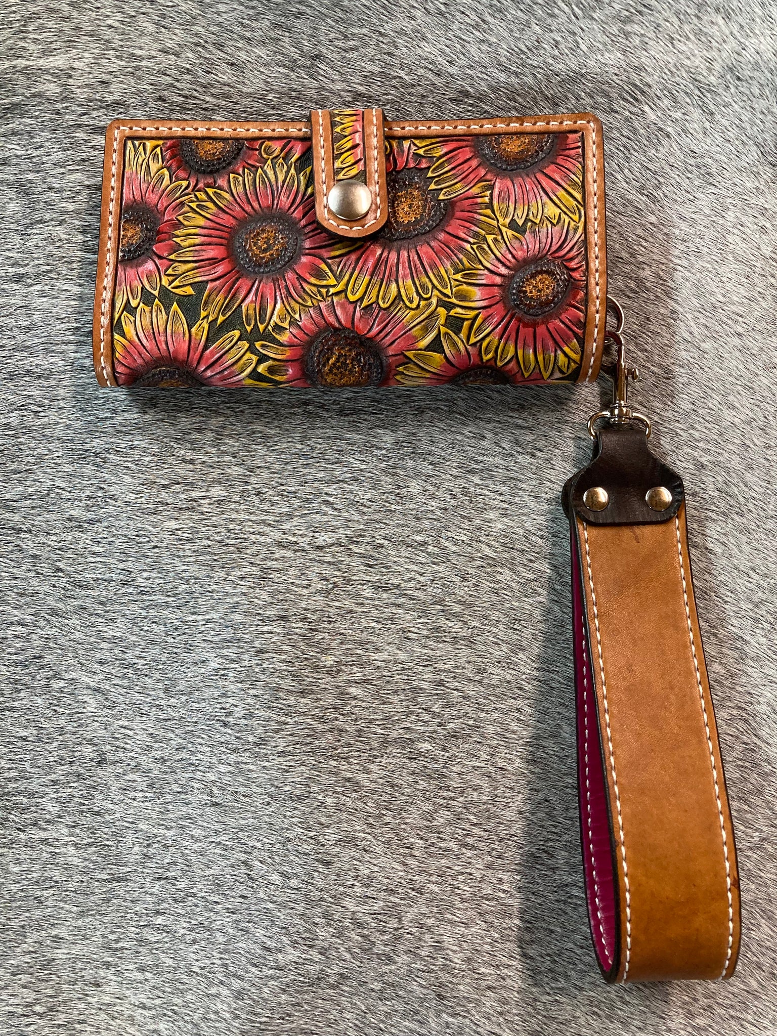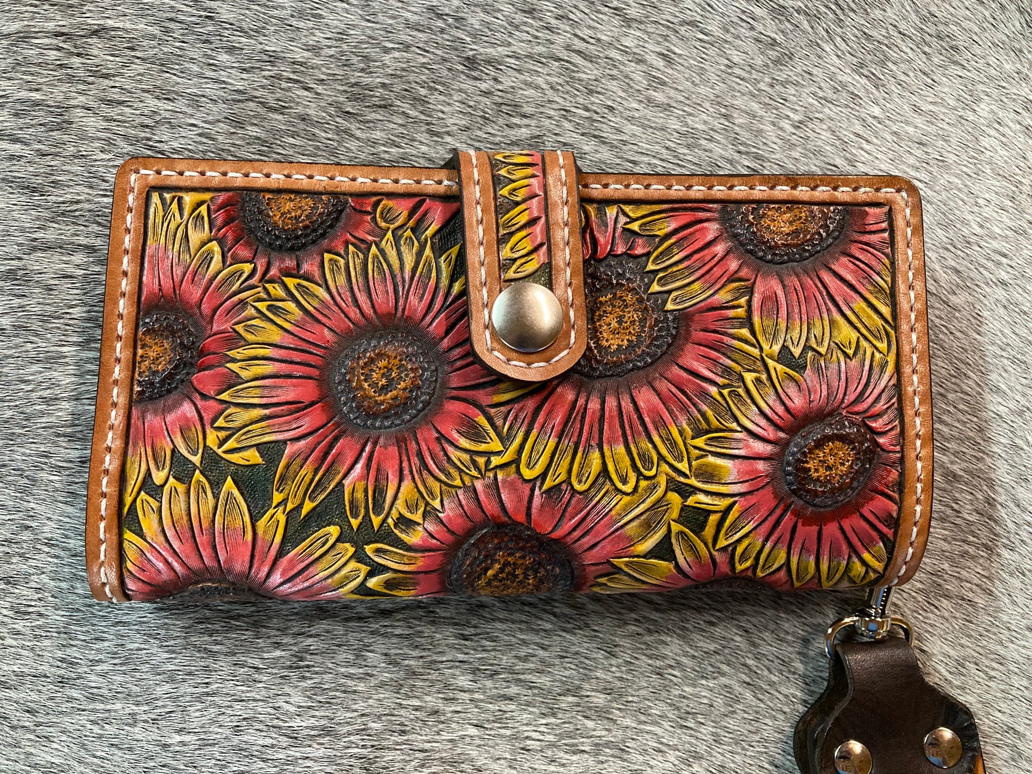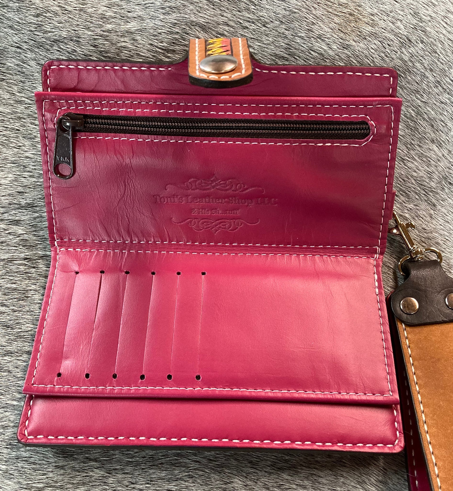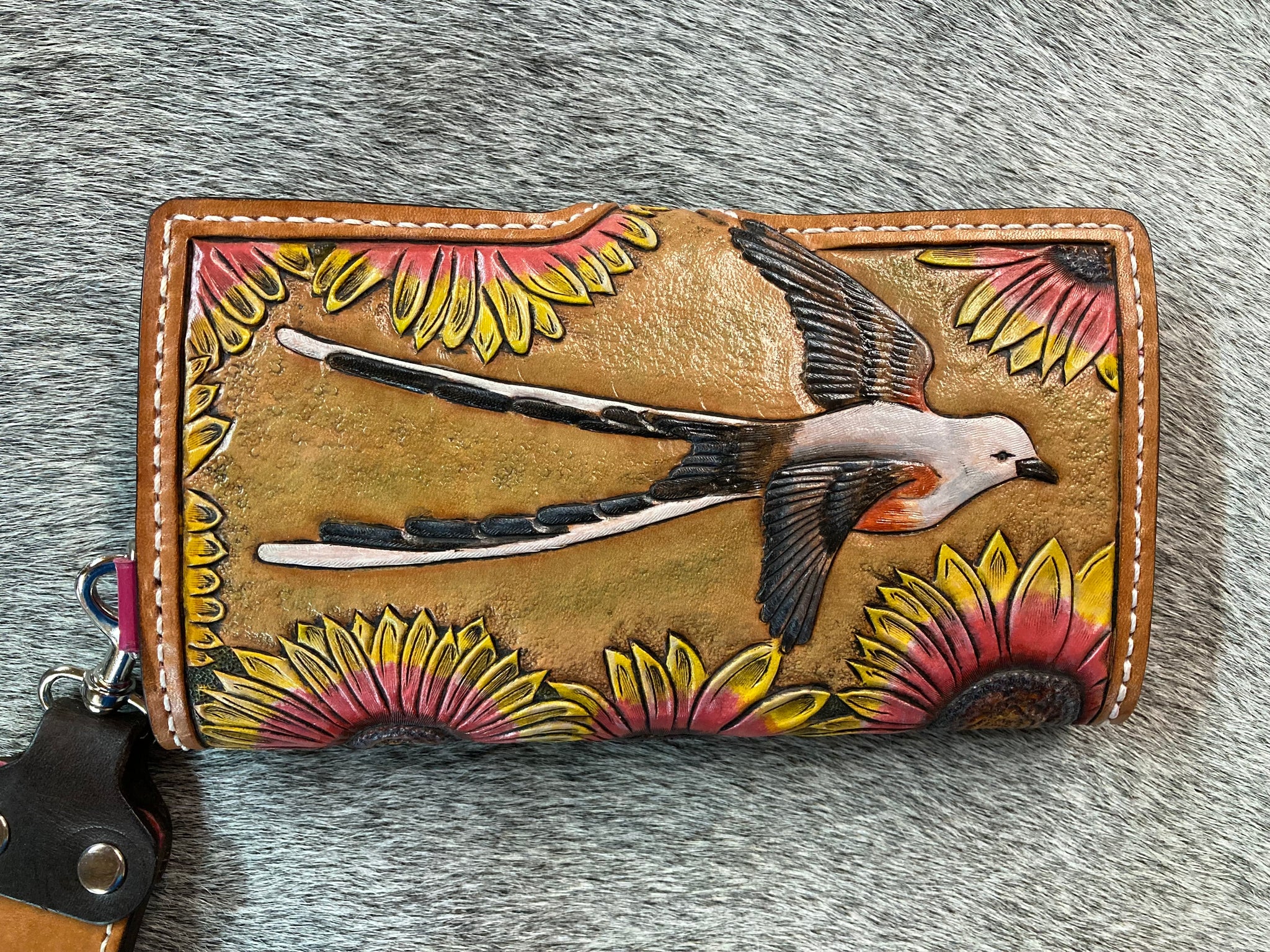 This beautiful hand tooled, one of a kind wallet is an original in Toni' Leather Shop. It has Indian Paint Brush flowers on the front and Scissor Tail Bird on the back.