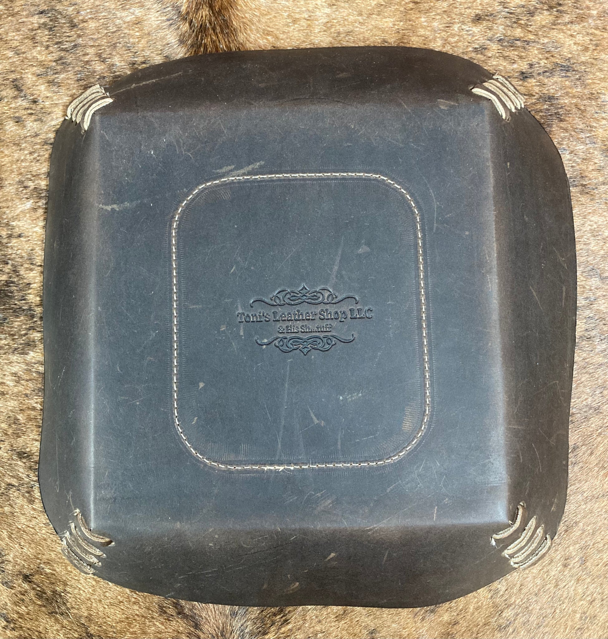 This valet tray is made of two layers of leather to make a firm tray. It is brown leather with a 4 color inlayed Aztec Cross on white/tan hair-on-hide.