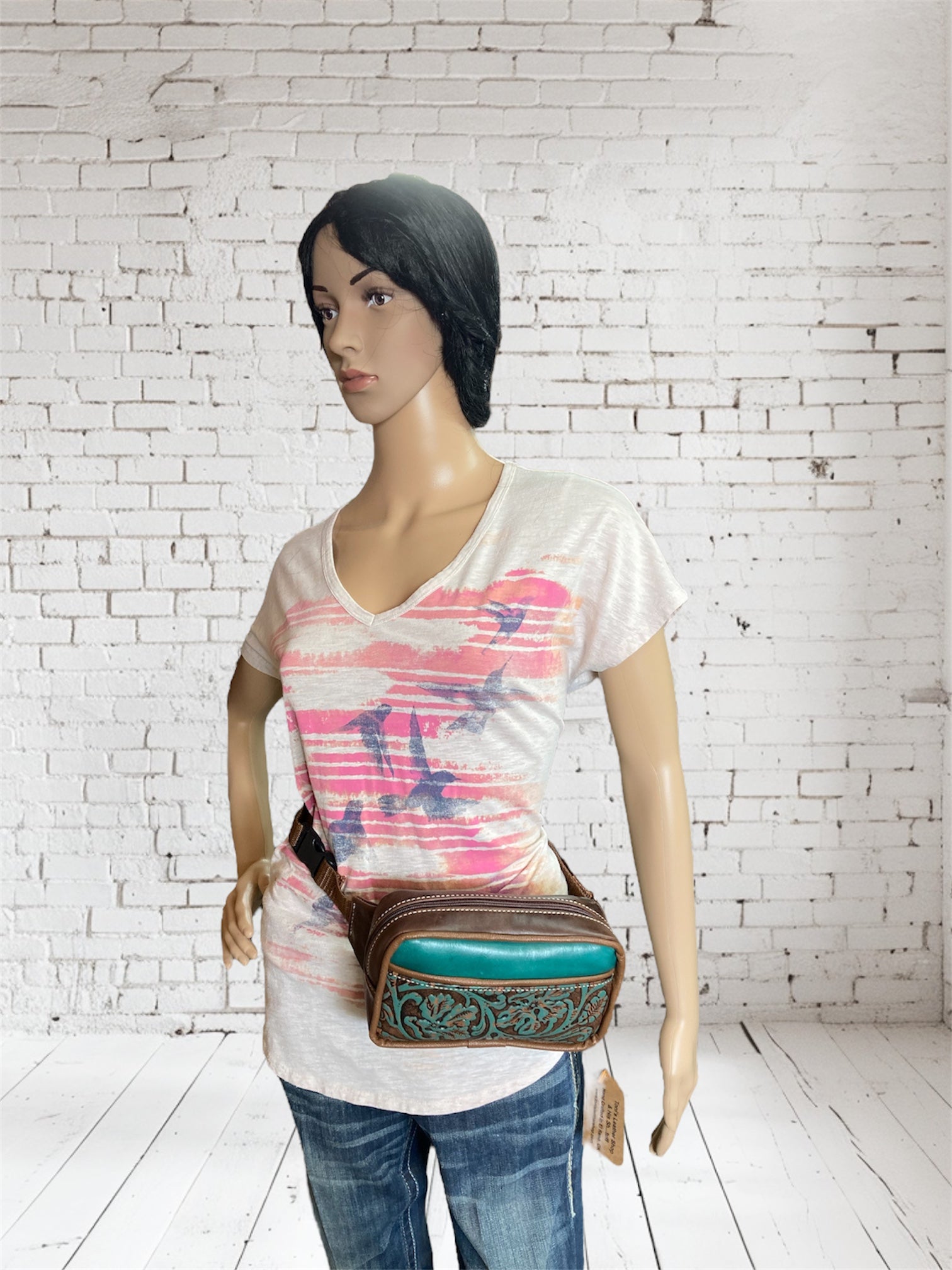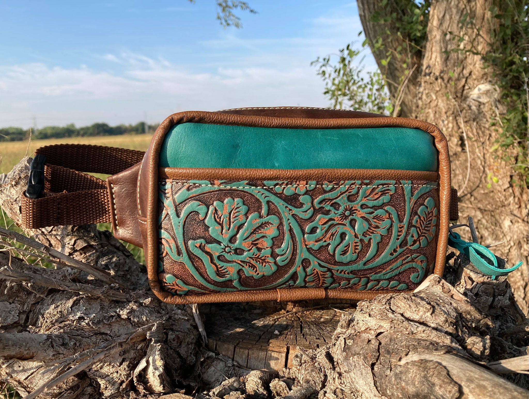 Elevate your everyday carry with this artisan-crafted leather crossbody/fanny pack, featuring Turquoise Floral Embossed leather with a matching mini wallet. Designed for style, versatility, and durability. Each piece is meticulously handmade, showcasing premium craftsmanship and timeless appeal.