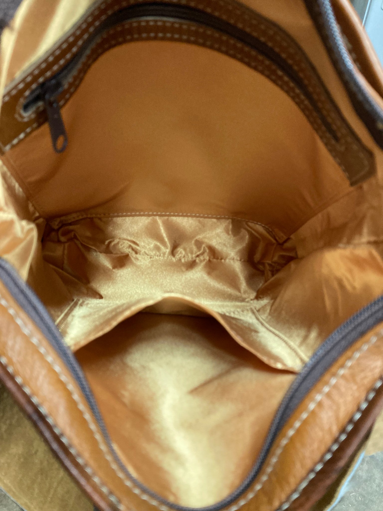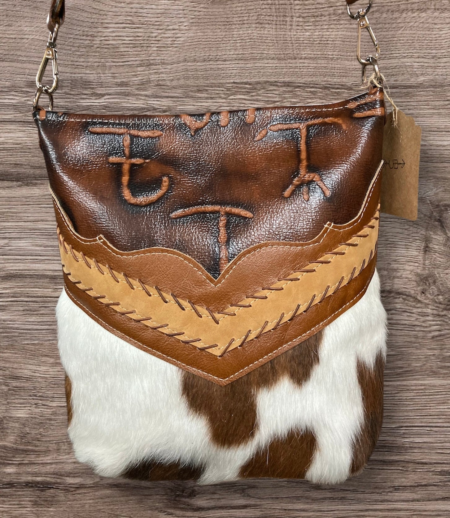 Elevate your style with this artisan-crafted leather crossbody purse from Tonji's Leather Shop. Featuring a striking tri-color hair-on-hide exterior, this bag blends rustic charm with elegant detailing. Embellished with rich brown and tan tones of leather. It's designed to turn heads while staying timeless.