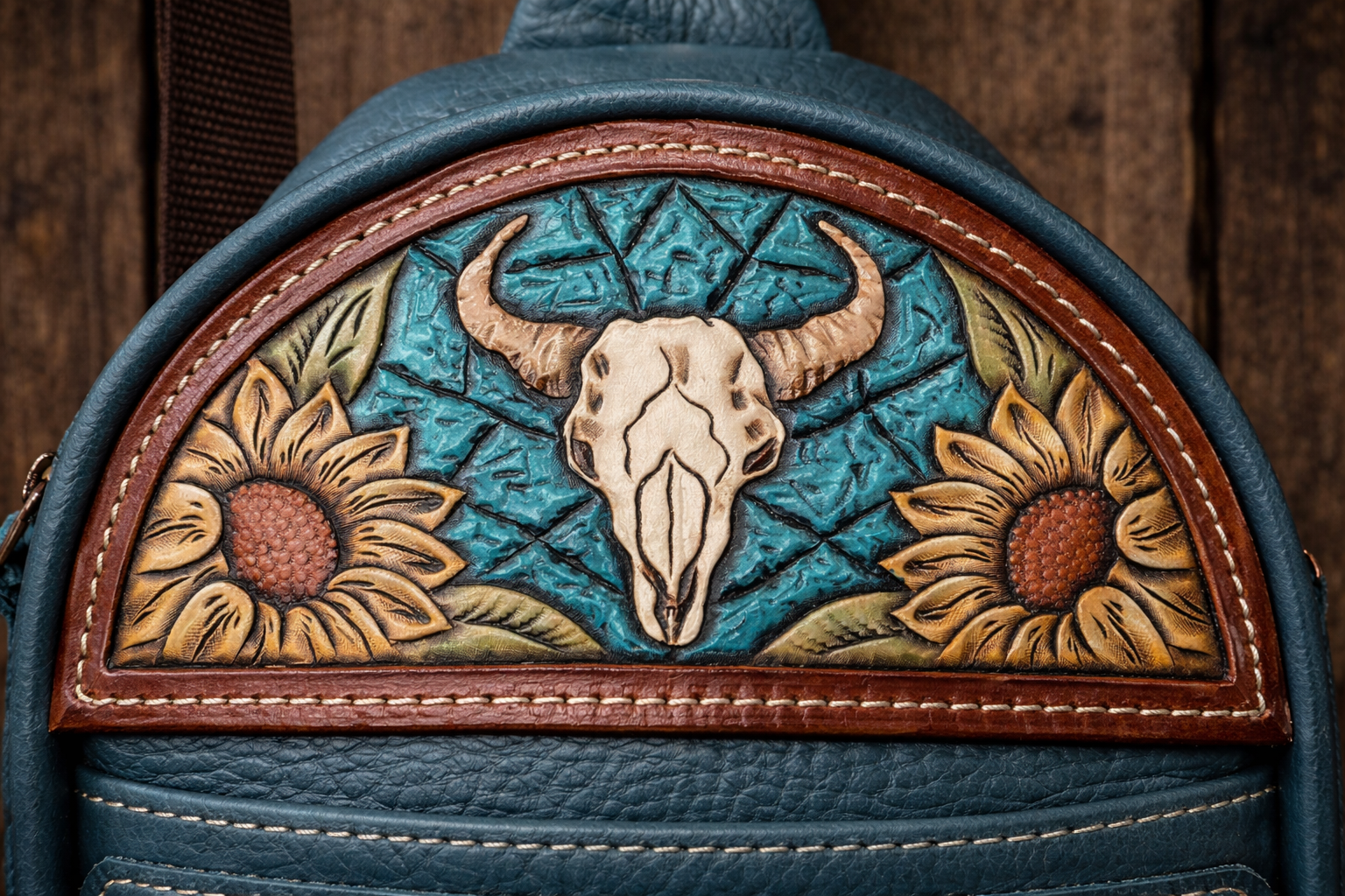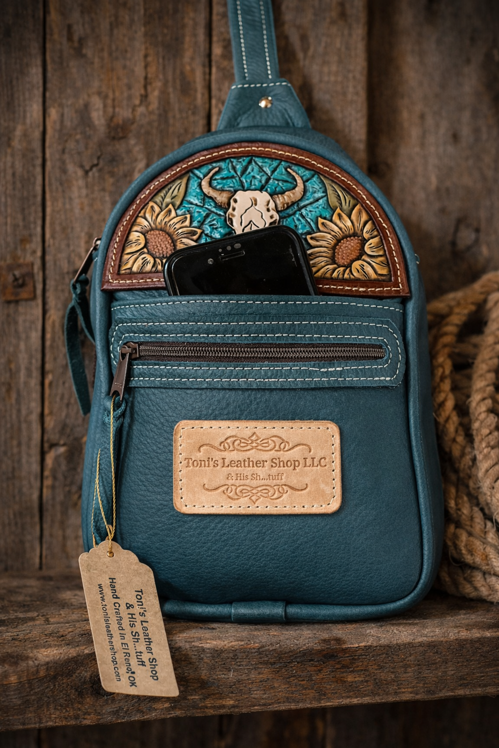 This soft leather Sling Bag is perfectly sized-spacious enough for the essentials yet compact enough for everyday convenience. Deep Teal leather with a hand tooled cow skull, sunflowers and turquoise stone background.