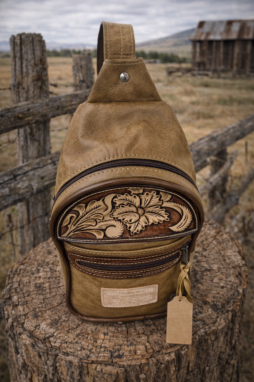 This leather Sling Bag is perfectly sized-spacious enough for the essentials yet compact enough for effortless everyday wear. Crafted from tan leather with brown piping, it features hand tooled floral carving that adds timeless Western character and artisanal detail.
