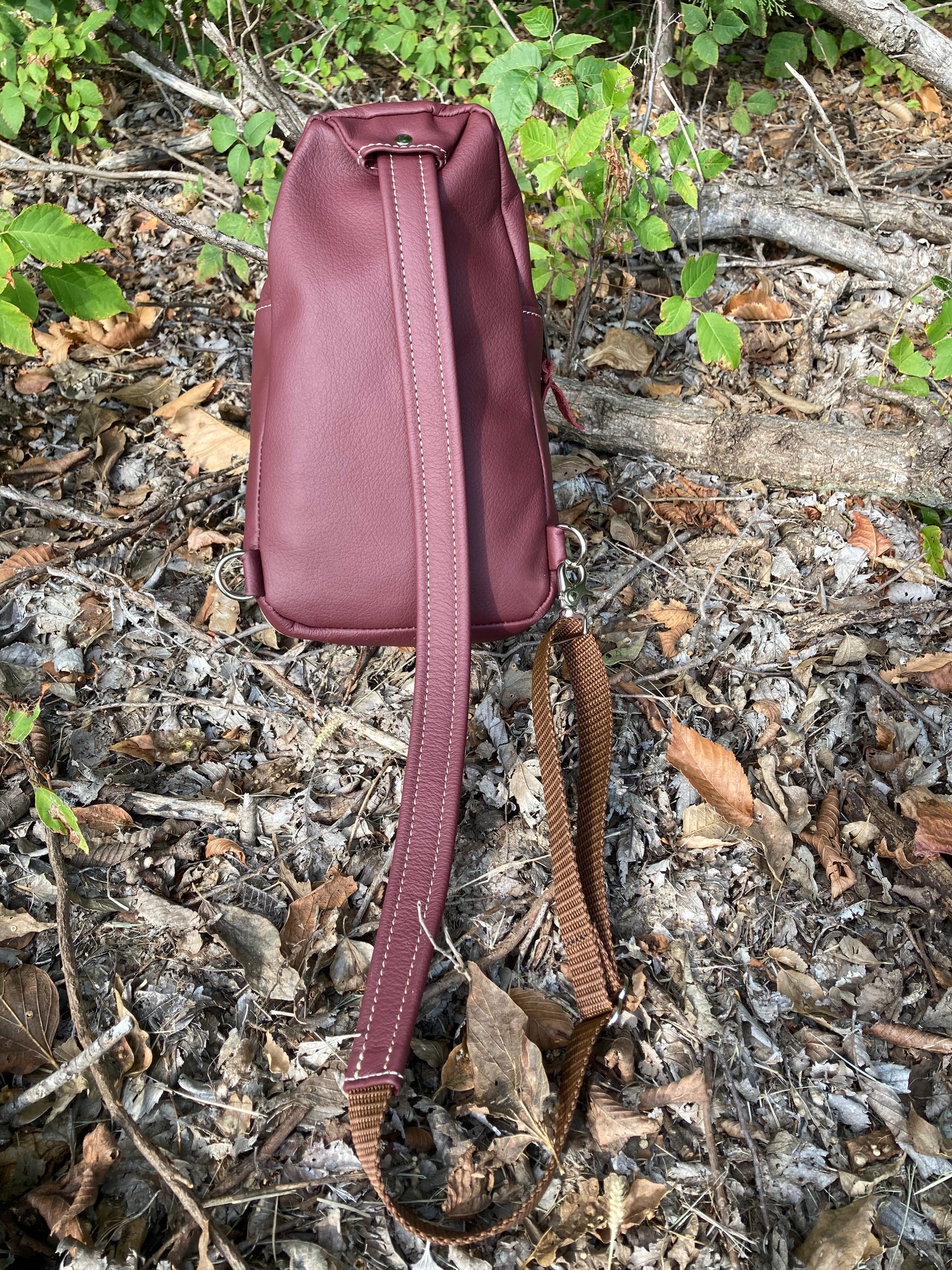 This leather Sling Bag is perfectly sized-spacious enough for the essentials yet compact enough for everyday convenience. Crimson leather with cream leather accents.